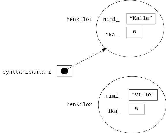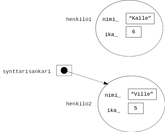 sama osoitin onkin kääntynyt osoittamaan olioon henkilo2